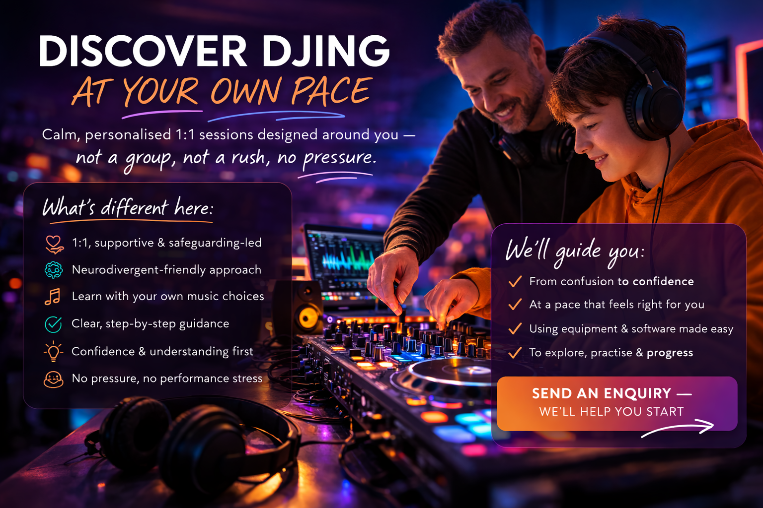 We’ll explore music and DJing at your pace, using music you already love.
