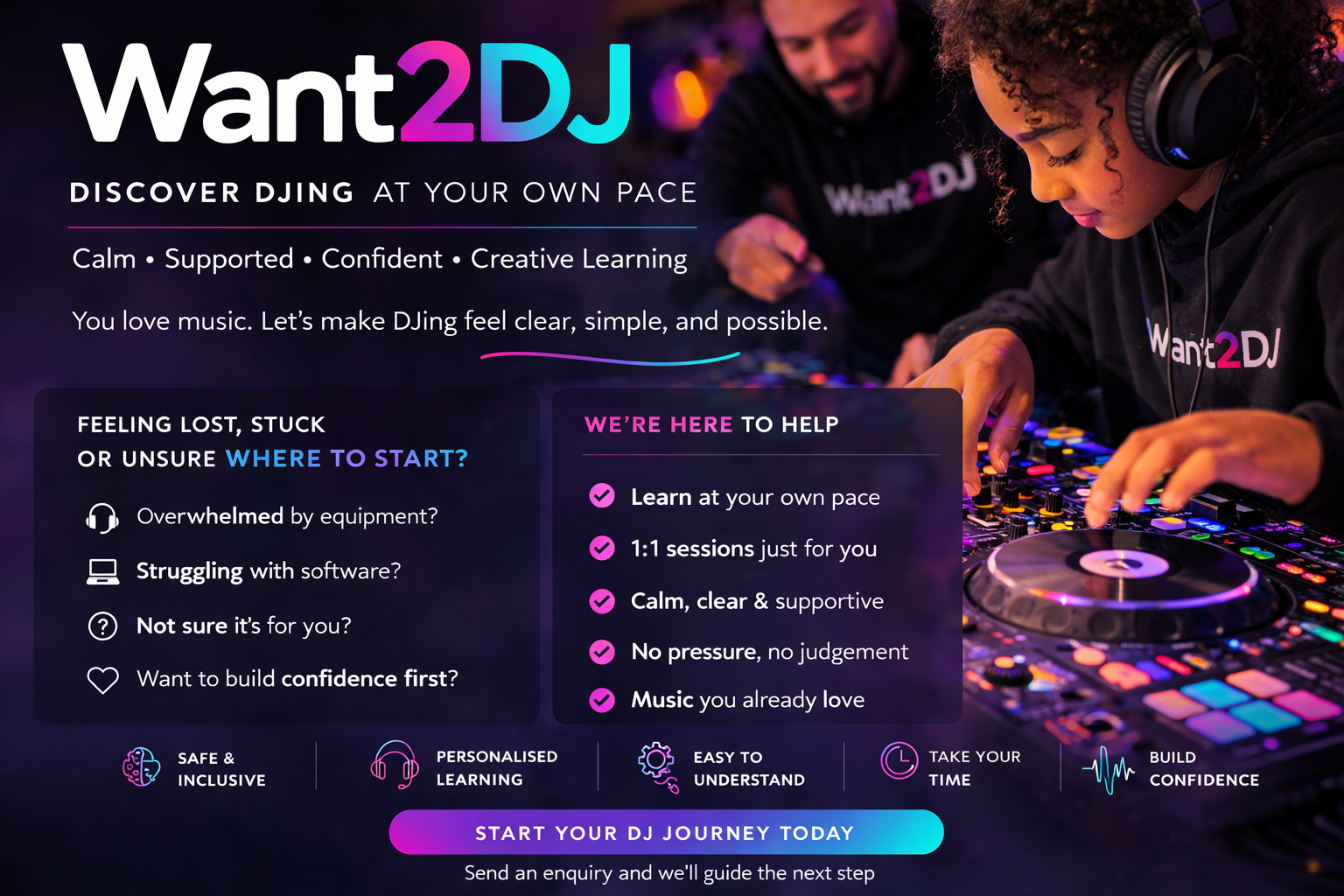 Want2DJ supports people who love music but feel overwhelmed or unsure around technology, equipment, or software. We offer a calmer, clearer way to learn, with safety, time, and care built in.